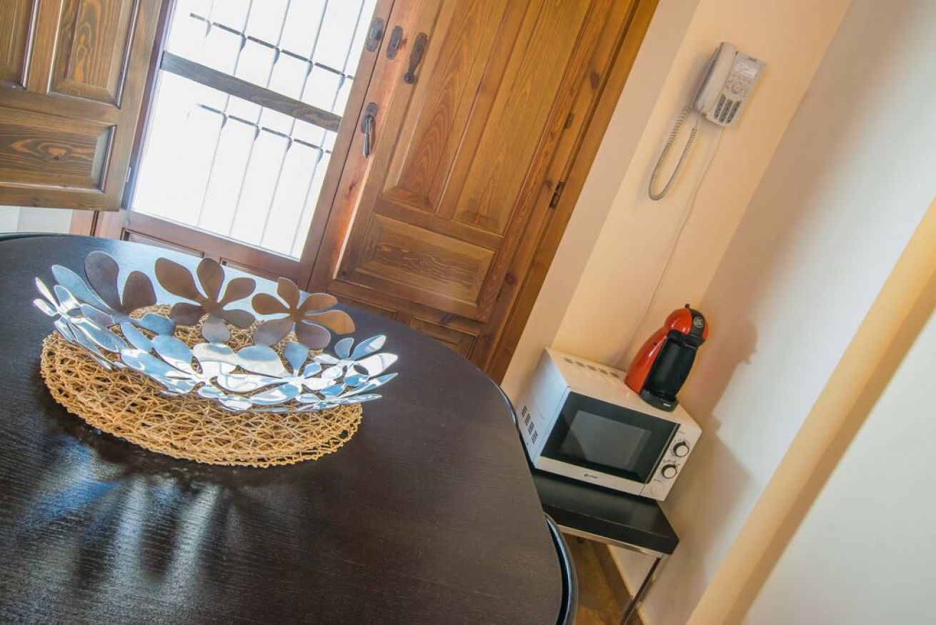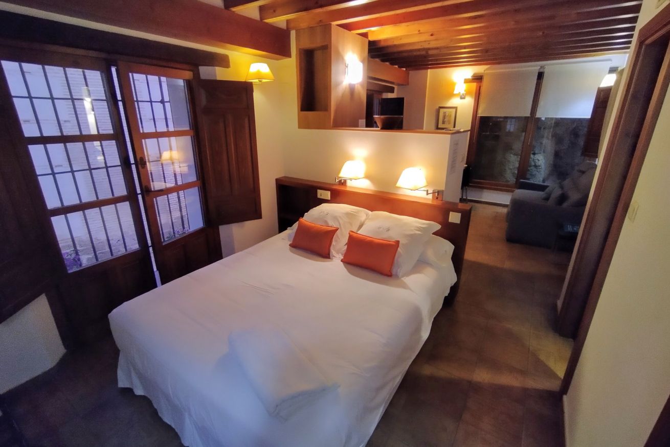 Studios of 22 M2 with spectacular views of the Alhambra that has a double bed of 150×200, sofa bed of 120×200 and living and dining area with kitchenette, also a piece of Arab wall (S. XII) integrated. They have two small balconies / viewpoints with beautiful side views of the Alhambra. We have 2 studios with side views.